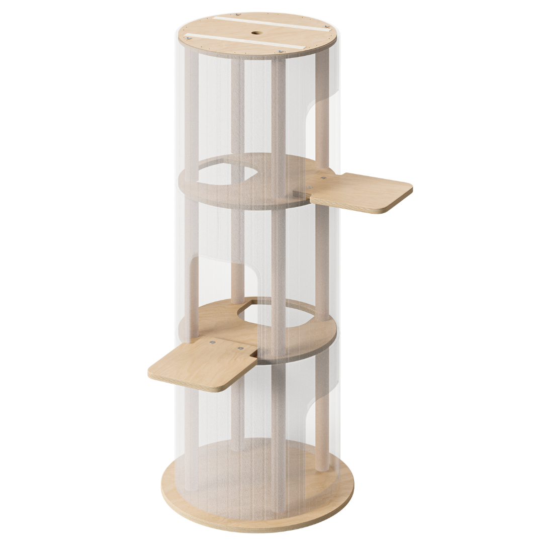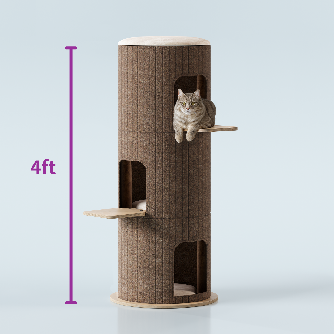 A 4ft modern, year-round cat tower with multiple levels, cozy cushions, and hidden passages for exploration.